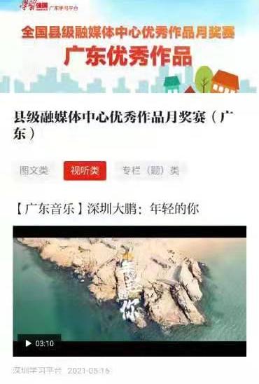二是响应活动,优秀作品传递大鹏“好声音”。积极响应、参与“学习强国”学习平台举办的系列活动,涌现出一批展现大鹏风貌、讲述大鹏故事、传递大鹏声音的优秀作品。其中《广东深圳大鹏新区:聚焦“海韵大鹏”,加快建设“海洋+”儿童友好型城区》《灯火里的中国》歌曲MV等稿件被“学习强国”平台首屏首页推荐,主题MV《年轻的你》《大湾区青年在深圳大鹏深情表白》分别在学习强国全国县级融媒体中心优秀作品月奖赛中获评广东优秀作品、三等奖。《南澳舞草龙》等作品获得广东乡村微视频大赛优秀奖。《南澳龙舟赛》等作品获得广东平台“走向我们的小康生活”大赛摄影类三等奖。