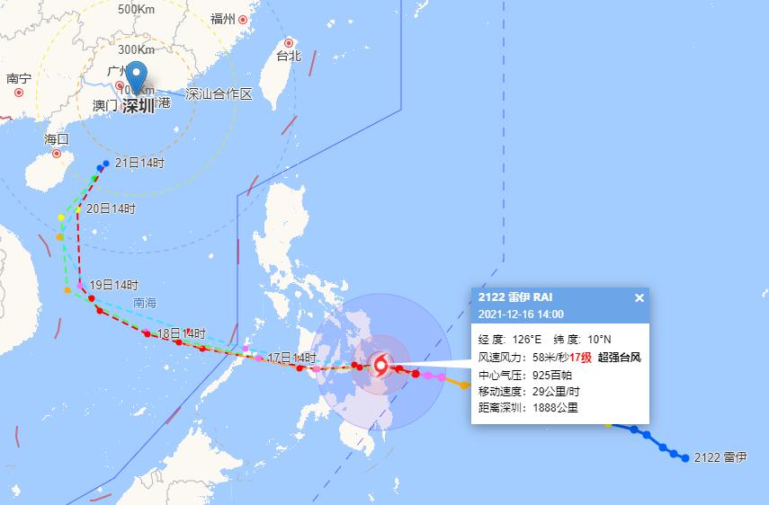 今年第22号台风“雷伊”(超强台风级)16日14时位于菲律宾马尼拉东南方向约750公里西北太平洋洋面上,预计未来以西行为主,将于17日夜间至18日上午进入南海南部海面,19日起转向北行并快速减弱。
