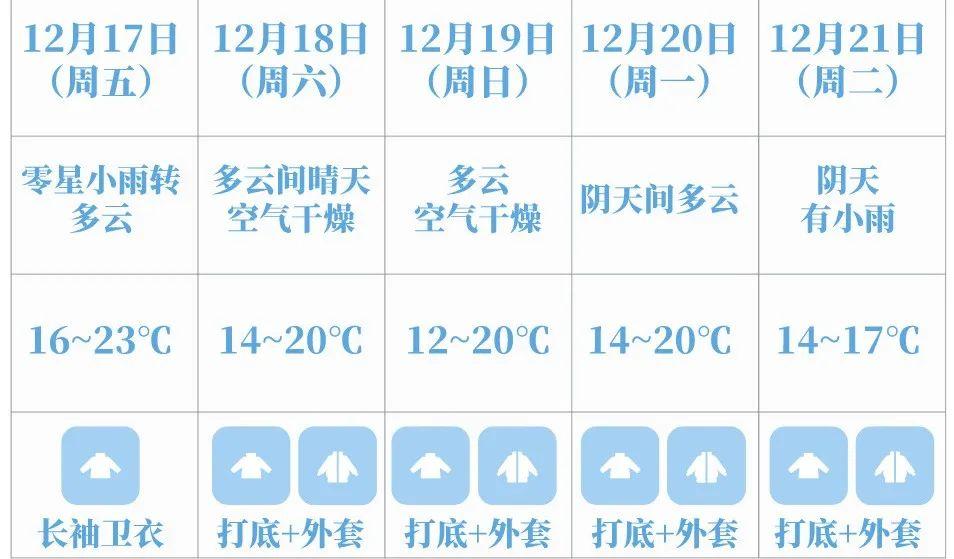 17日零星小雨转多云,气温16-23℃,凌晨起北风开始加大,白天沿海高地和海区最大阵风8级,气温下降。
