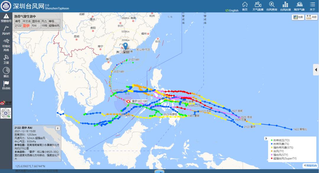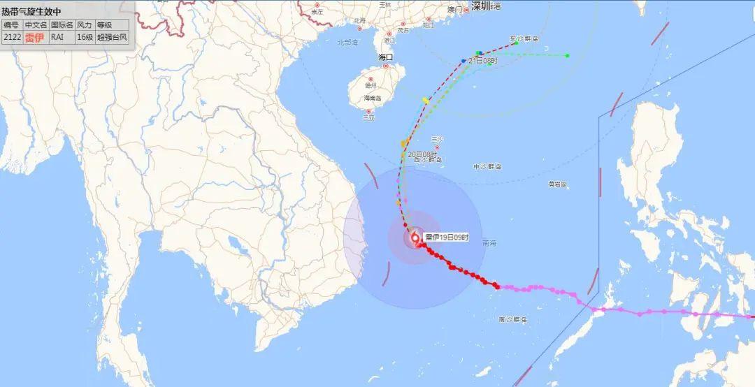 今年第22号台风“雷伊”(超强台风级)18日14时位于我市偏南方约1265公里的南海海面上,19日起将逐渐转向偏北方向移动,向海南岛东南部海面靠近,强度减弱,并将于21日在南海西北部海面减弱消失。