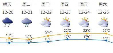 19日多云到晴天,空气干燥,早晨最低气温12℃,体感较冷,白天最高气温18-19℃,沿海、高地和海区最大阵风6-7级。