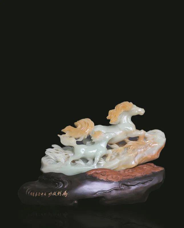 说明:马之形体,可谓晨善尽美。晋代傅实《乘用马赋》述展马之风神。"目若曜星。符采横发。高颇悬日,双璧象月,头似削成,鬣似鬓发。延首高骧,摧足轩踌。气盖青云,势凌万里。九方不能测其天机,秦公不能究其妙理。”这件作品取材于青田名石封门青,淡青色如春树初发,令人心旷神怡。作品表现的正是奔马的矫健形态:两匹骏马在草原上奔腾,轻捷豪迈,若有漂凛雄风扑面面来。碧草浮动,隐没马蹄,但马的四肢形体及肌肉的力量感仍被传神地表现了出来。作者巧用黄色冻石雕成的马糕利马尾显得尤为醒目,飘逸灵动,衬托出骏马飞奔时勇往直前的浩荡声势: