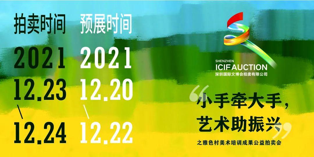 深圳国际文博会拍卖有限公司将于2021年12月23日至24日于文博会拍卖小程序举办文博会公益拍卖。本场拍卖会将拍卖包含爱心艺术家无偿捐献的精品力作52件书画艺术品,由东方国石文化产业(深圳)有限公司筹集的名家名石精品12件作品,深圳国际文化产业博览交易会公司2021年度“小手牵大手,艺术助振兴”之雅色村美术培训成果师生作品47组,共计111件拍品。