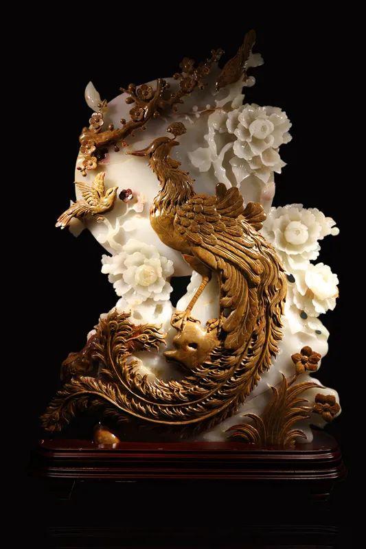 说明:凤凰是中国古代传说中的“百鸟之王”而牡丹则是“花中之王”,在中国传统雕刻作品中,常把凤凰和牡丹结合起来,雕刻凤凰屹立在牡丹花从中,或凤凰环绕牡丹花飞翔的图案,称为“凤穿牡丹”或“牡丹引凤”象征着美好富贵、光明幸福。这件作品取材于昆仑玉,雕工细腻精巧,布局自然流畅,极具视觉美感。凤凰栩栩如生,生动传神,凤尾摆动,风头回勾,顾盼生姿,动感十足牡丹雍容华贵,整件作品洋溢着一种富贵吉祥之气。