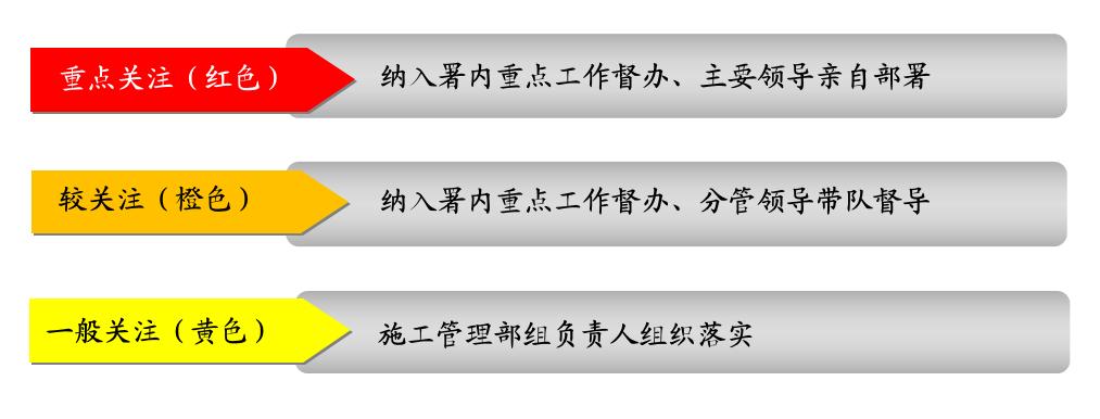 二是管控分级,制定差别化管控措施,重点关注(红色)纳入署内重点工作督办、主要领导亲自部署;较关注(橙色)纳入署内重点工作督办、分管领导带队部署;一般关注(黄色)施工管理部组负责人组织落实。