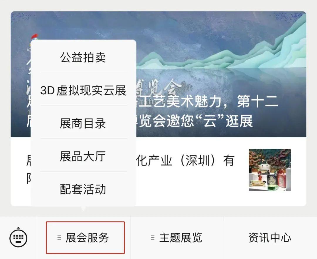 进入“文博会”公众号,点击下方菜单栏“展会服务”,