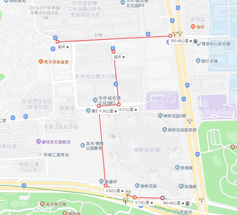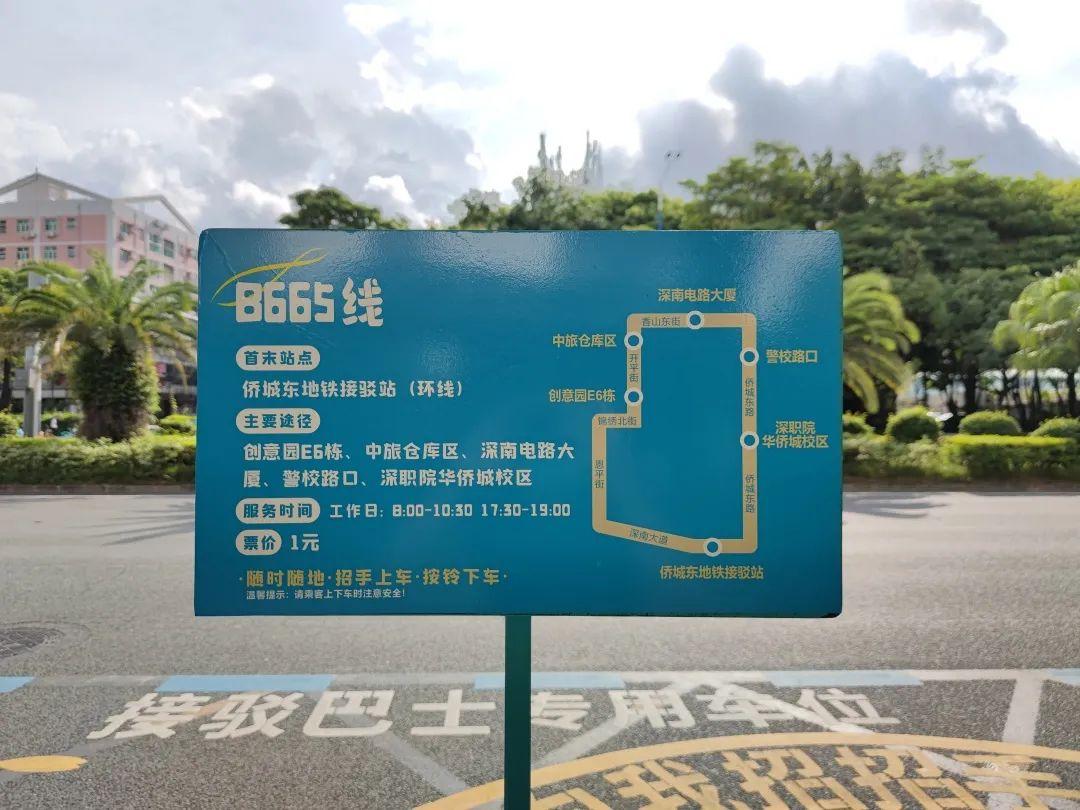 侨城东地铁接驳站、创意园E6栋(招呼站)、中旅仓库区(招呼站)、深南电路大厦(招呼站)、警校路口(招呼站)、深职院华侨城校区、侨城东地铁接驳站
