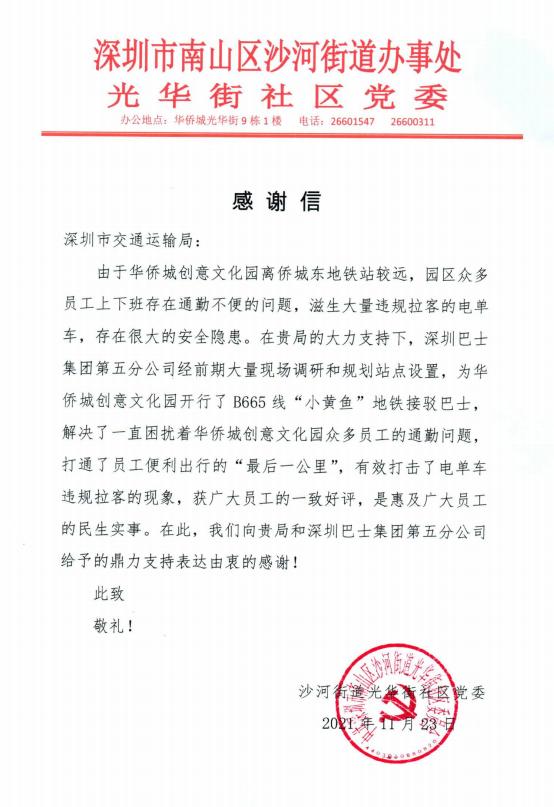 B665线的开通,成功解决了困扰华侨城创意文化园片区上班族的通勤问题,打通了市民便利出行的“最后1公里”,还获得了沙河街道光华街社区的感谢信。