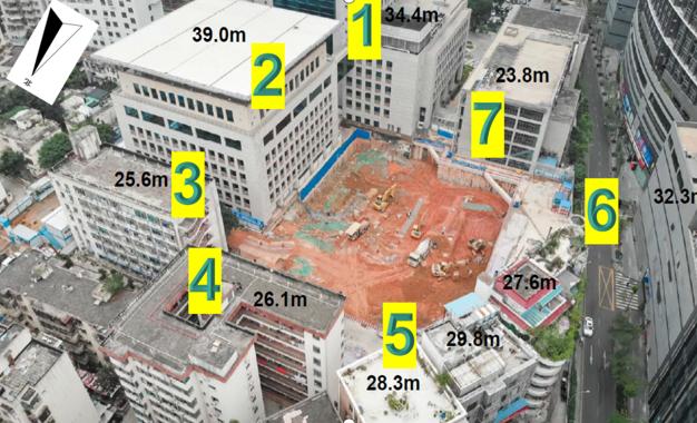 项目深基坑达20米,周边建筑密集,多为天然地基浅基础,基坑安全风险大。