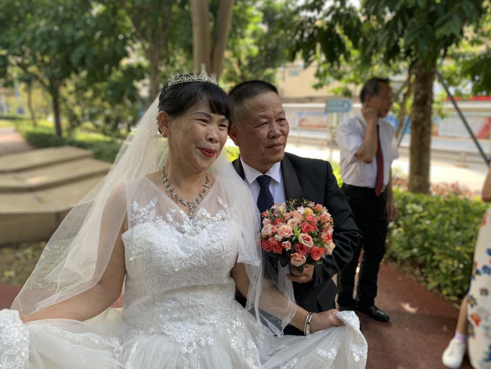 许多参与者怀着期待的心情提早到达拍摄地点,最早到场的詹阿姨穿上了工作人员挑选的婚纱感慨道:“结婚25年了连合照都没拍过,有这次机会补拍婚纱照真的太感谢了。”在一旁耐心等待的老伴开心地上前牵起詹阿姨的手,细心地拉起裙角,两人一起走到公园,在小孙女的陪伴下完成了婚纱拍摄,弥补了没有拍摄婚纱照的遗憾。