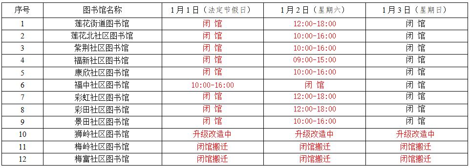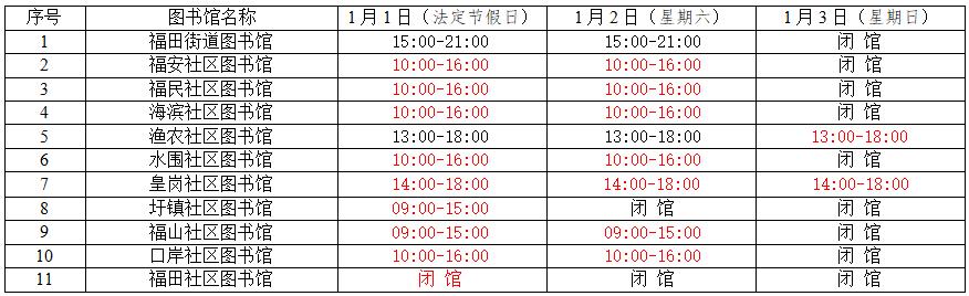 转眼间2021年已经进入倒计时这意味着元旦假期马上就要来啦。相信热爱读书的你一定很需要这份福田区图书馆及福田区各社区公共图书馆元旦开放时间一览表吧。2022年的新年第一天小福陪你一起过~2022福田区图书馆元旦开放时间表2022福田各街道社区图书馆元旦开放时间表园岭街道园岭街道图书馆咨询电话 22208532南园街道南园街道图书馆咨询电话 82515855福田街道福田街道图书馆咨询电话 83804251沙头街道沙头街道图书馆咨询电话 82046059华富街道华富街道图书馆咨询电话 83236007梅林街道梅林街道图书馆咨询电话 83117460香蜜湖街道香蜜湖街道图书馆咨询电话 82878139莲花街道莲花街道图书馆咨询电话 83079153华强北街道华强北街道图书馆咨询电话 83997342福保街道福保街道图书馆咨询电话 23483187主题馆具体开馆时间以各馆公示为准书虫们赶快收好时间表别吃“闭门羹”啦