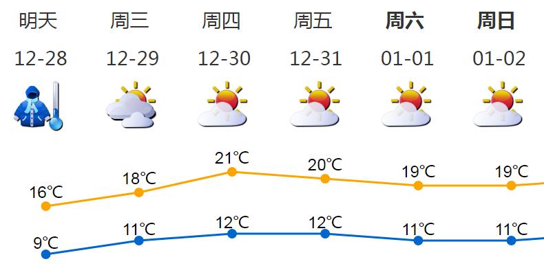 28日多云,早晚寒冷,白天可见阳光,气温9-16℃,体感温度从27日的3.9℃上升到9.0℃。