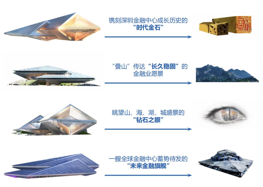 “金石”寓意镌刻深圳金融中心成长历程的“时代金石”,“叠山”意向传达长久稳固的金融业愿景,简洁且动感的线条沿深南大道勾勒出一艘蓄势待发的“未来旗舰”。