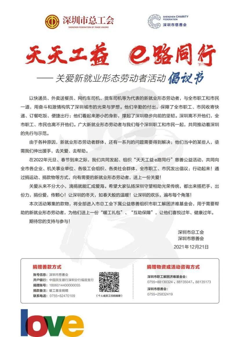 为给新就业形态劳动者送去更多温暖,深圳市总工会发起“天天工益 e路同行”慈善公益活动,为“深工有爱、守望相助”公益项目募集资金1000万元,为新就业劳动者群体提供职工保险保障、困难救助、医疗救助、关爱慰问等服务。