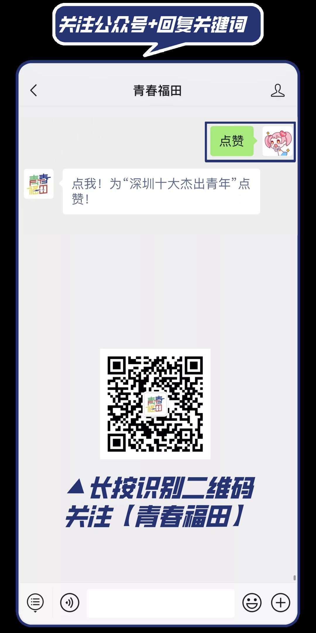 关注【青春福田】微信公众号,对话框回复“点赞”,点击弹出的链接进入风采展示点赞界面,即可为你心目中的杰出青年点赞啦!