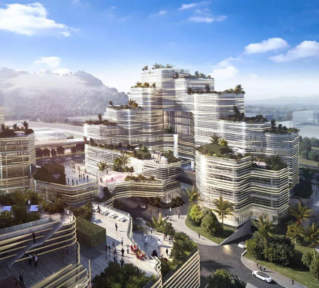 从高空俯瞰,生物家园每栋楼均为多边形,结合西临山、东向海的地理条件,打造贯穿项目的山海绿轴,结合生态型、花园式园区设计,犹如坝光湾畔“会呼吸”的“细胞”。