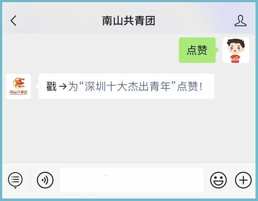 关注“南山共青团”微信公众号,对话框回复“点赞”,点击弹出的链接进入风采展示点赞界面,即可为你心目中的杰出青年点赞啦!