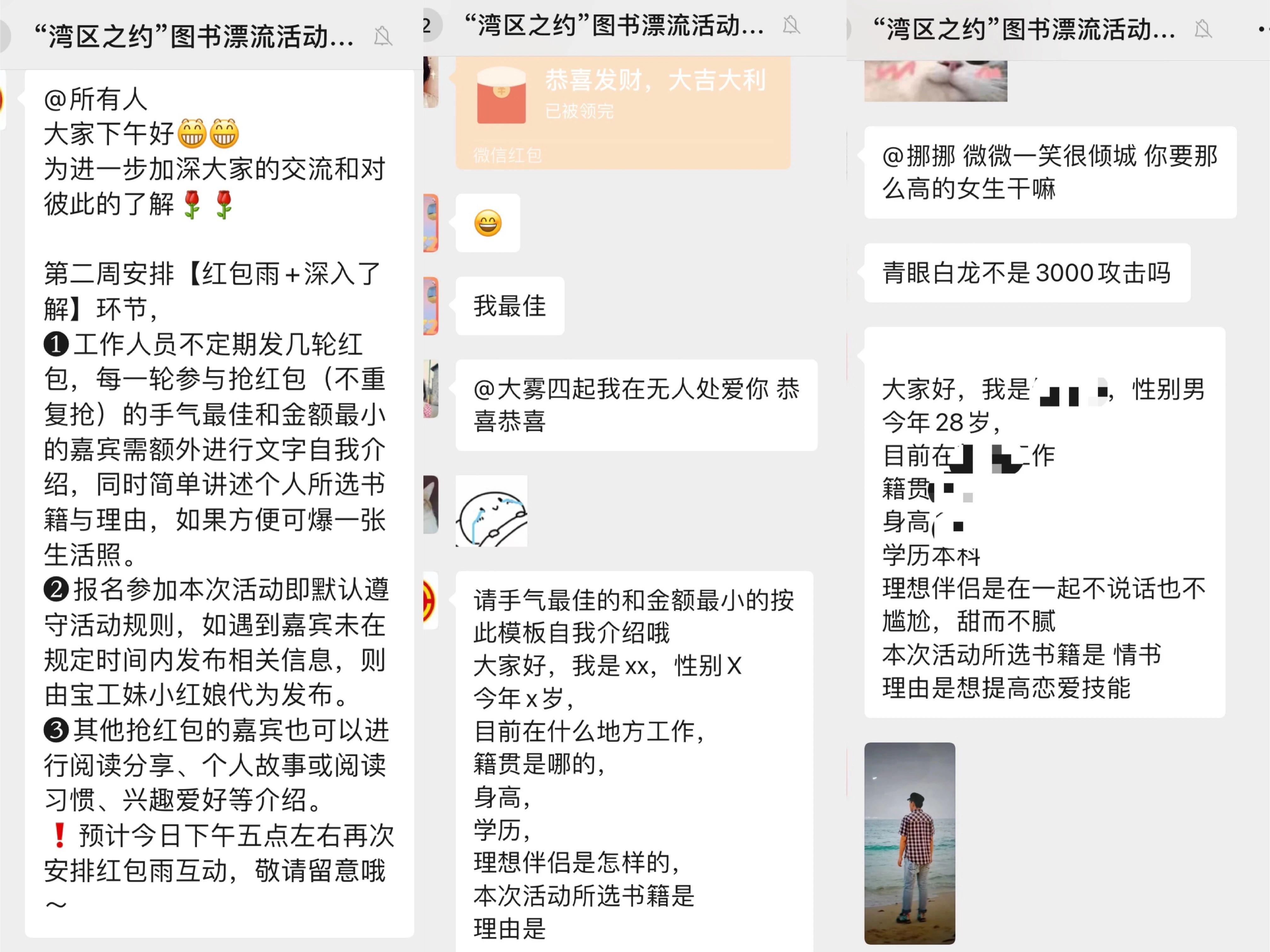 本次活动通过读书打卡和“红包雨”+深入了解等环节,让大家更好地交流了读书心得与认识彼此,可以在轻松愉快的氛围中扩大交友圈,达到了以书会友的目的。