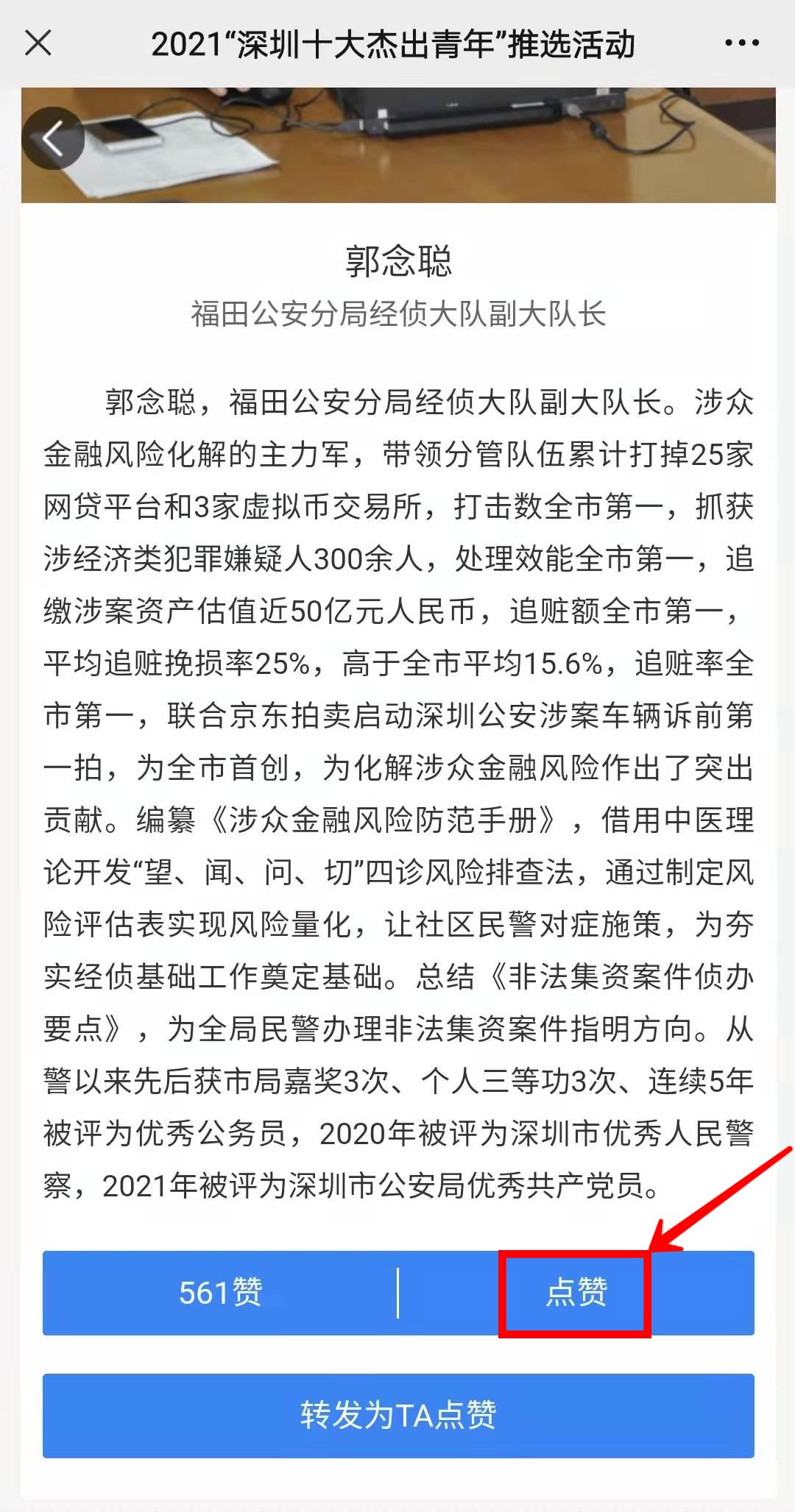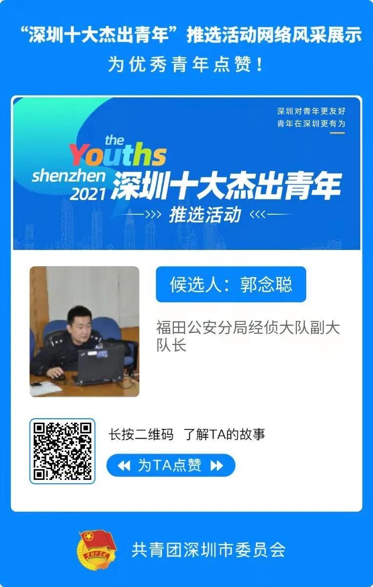 经推荐报名、层层推选和资格审查,深圳市公安局福田分局郭念聪、杨健、周炜尧从众多候选人中脱颖而出,进入网络风采展示,快来为他们点赞吧!