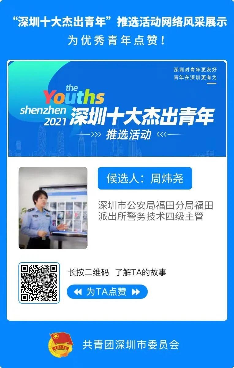 周炜尧,深圳市公安局福田分局福田派出所警务技术四级主管。她以所为家,坚守岗位,每日工作时间至少15小时,带领30余人团队出色地完成各项任务。面对警情,她争分夺秒,及时关注动态,提供强大的情报视频后台支撑。
