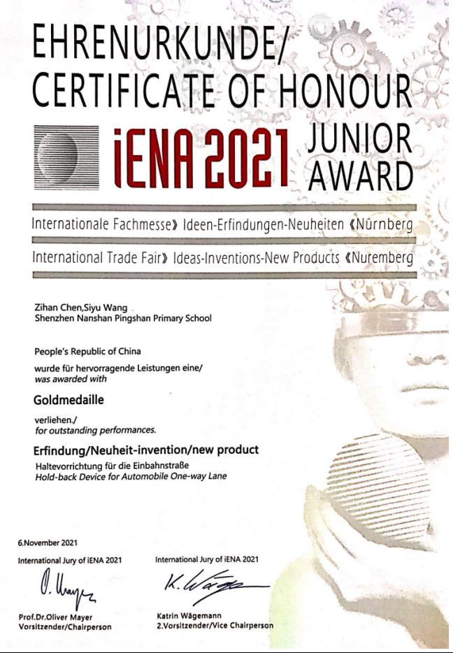 德国纽伦堡国际发明展给陈子晗同学及指导教师王思雨颁发的证书