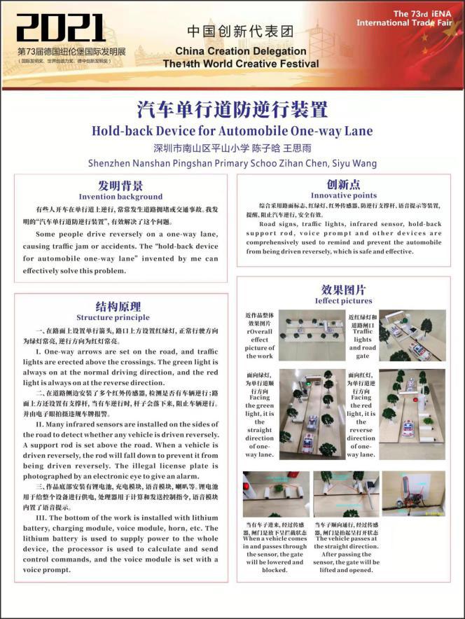 德国纽伦堡国际发明展 | 汽车单行道防逆行装置 | 陈子晗 | 王思雨 | 金奖 |
