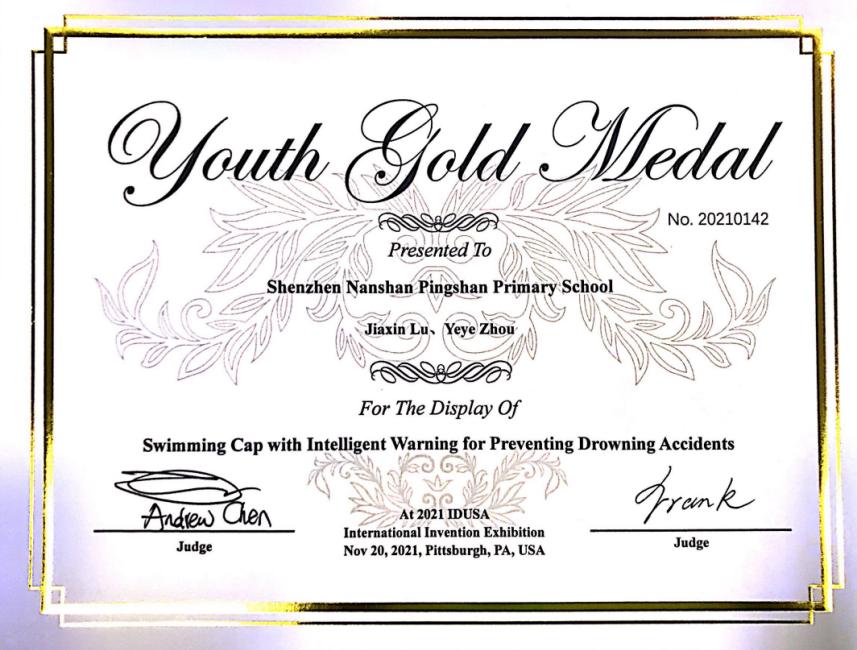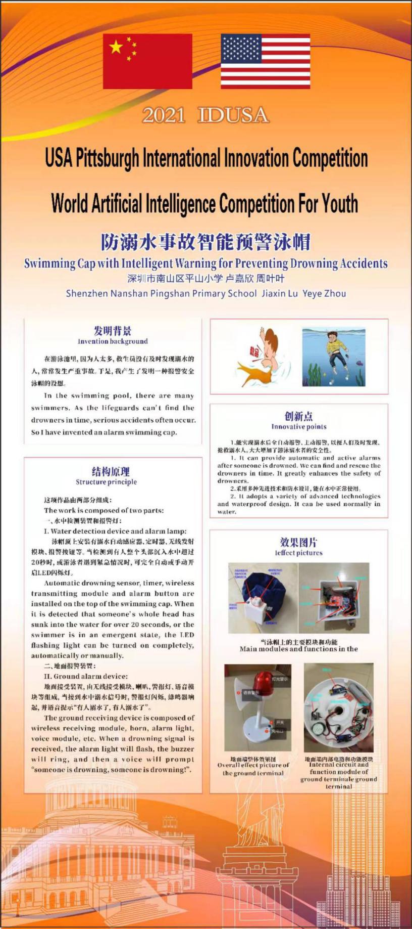 美国匹兹堡国际发明展 | 防溺水事故智能预警泳帽 | 卢嘉欣 | 周叶叶 | 金奖 |