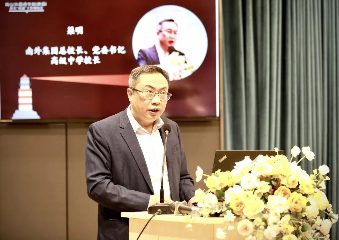 梁明在现场会上做了《求真务实,减负提质,打造高质量学校教育》主题报告。他指出,南外集团对双减工作有着充分认识和深刻解读,对此梁明提出双减工作的“六位一体”,即前提是高质量作业体系的建设、根本是学校教育的深度研究、关键是提高课堂效率、本质是学生教育、核心是教师队伍建设,重点是将高质量的作业体系建设纳入到高质量学校教育体系建设中。