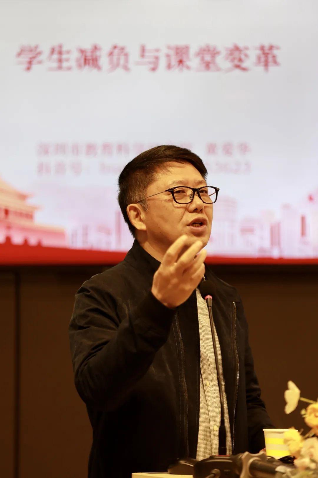 黄爱华在现场给大家带来了《学生减负与课堂变革》”的学术讲座,就减负的理解、作业的功能、深圳的顶层思考、减负提质的行动展开分析。