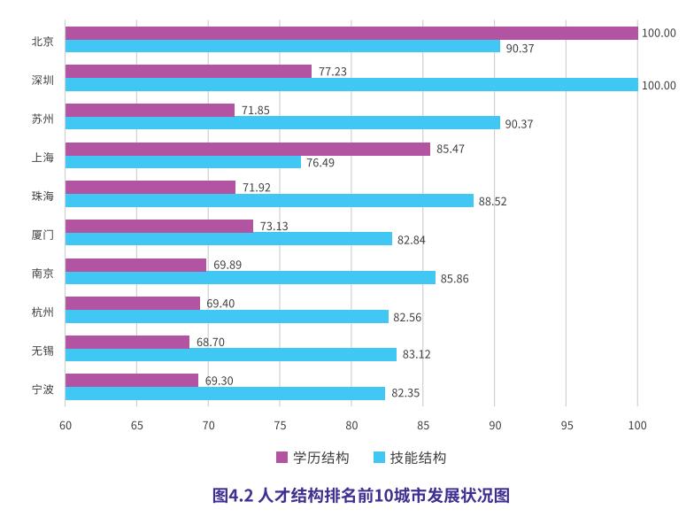 值得注意的是,不同城市的人才结构呈现不同的发展特征,北京、上海等城市人才学历结构更优,深圳、苏州等城市人才技能结构表现突出。