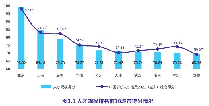 从各项得分来看,北京4项一级指标维度处于全面领先,各项得分均超过90分。其次是上海,各项得分均高于80分,但“人才结构”一项排名第四。深圳在“人才结构”和“人才效能”两项上仅次于北京,都排第二,在“人才规模”一项上位列北京、上海之后,排名第三,但在“人才环境”一项上排第四,亚于北京、上海和杭州。其他城市在四个不同维度发展各有所长,创新人才发展存在不均衡现象。