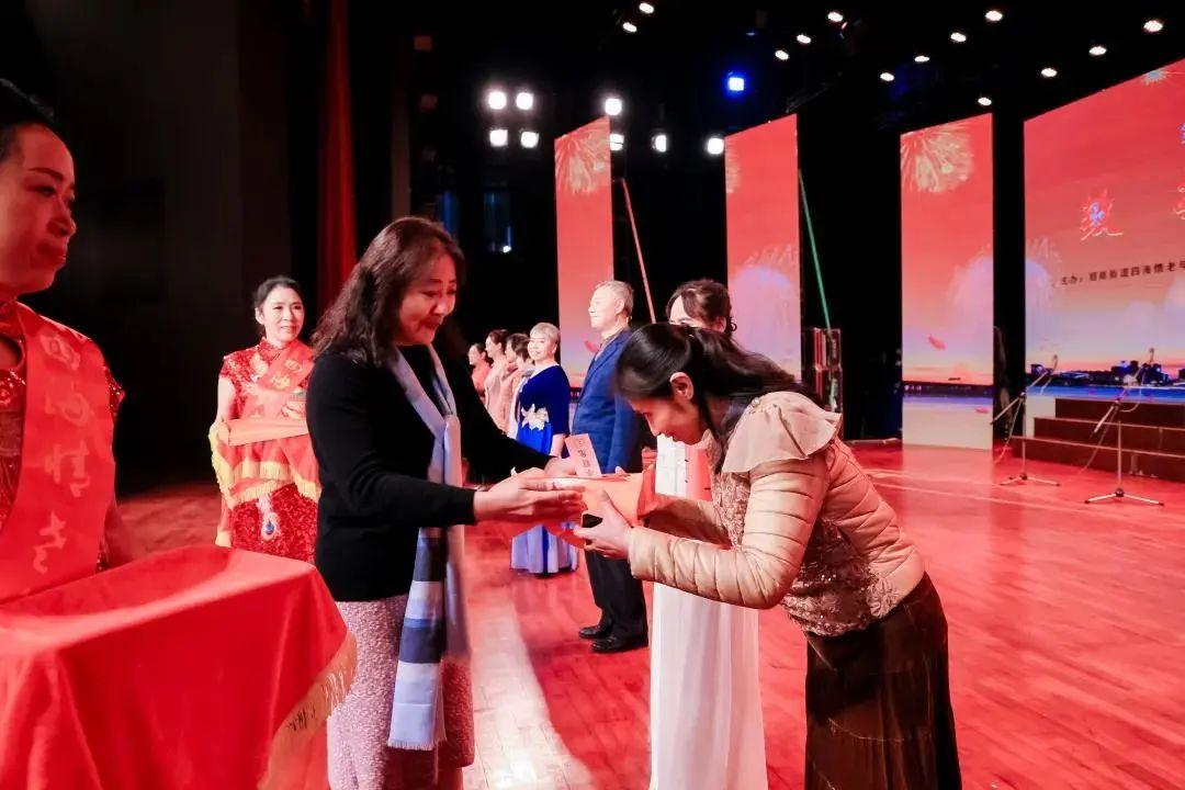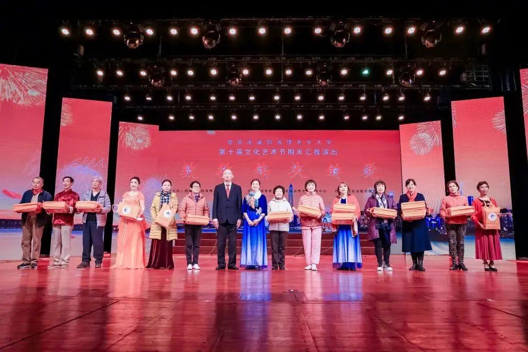 接下来是艺术节的保留项目——为每年年满60、70、80周岁的寿星祝寿。在欢快的乐曲声中,今年的18 名寿星被请上主席台,接受领导颁发的寿星礼品,他们个个脸上充满了幸福和喜悦。这是四海情老年大学尊老爱老的优良传统。