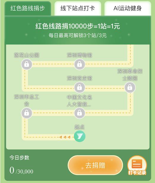 线上体验深圳公交3大红色线路34个站点,重温深圳革命历史,每日捐出每日运动步数解锁对应站点即可完成捐赠,每1万步捐赠1元。