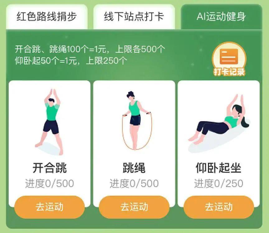 随时随地参与,可选择跳绳、开合跳、仰卧起坐等运动,完成对应数量即可进行捐赠。