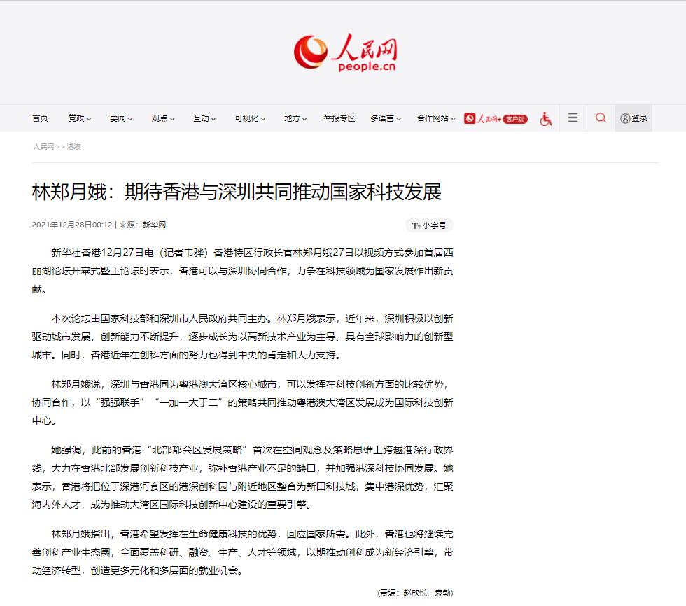 林郑月娥说,深圳与香港同为粤港澳大湾区核心城市,可以发挥在科技创新方面的比较优势,协同合作,以“强强联手”“一加一大于二”的策略共同推动粤港澳大湾区发展成为国际科技创新中心。