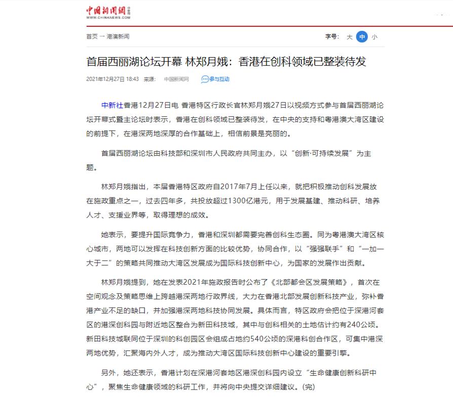 香港特区行政长官林郑月娥27日以视频方式参与首届西丽湖论坛开幕式暨主论坛时表示,香港在创科领域已整装待发,在中央的支持和粤港澳大湾区建设的前提下,在港深两地深厚的合作基础上,相信前景是亮丽的。