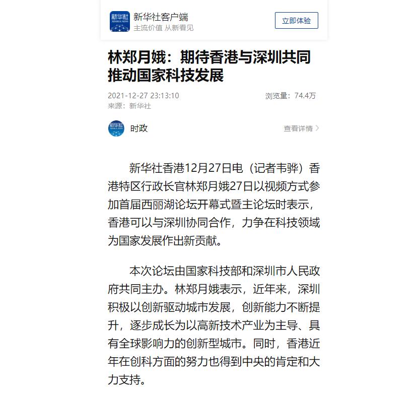 林郑月娥:期待香港与深圳共同推动国家科技发展