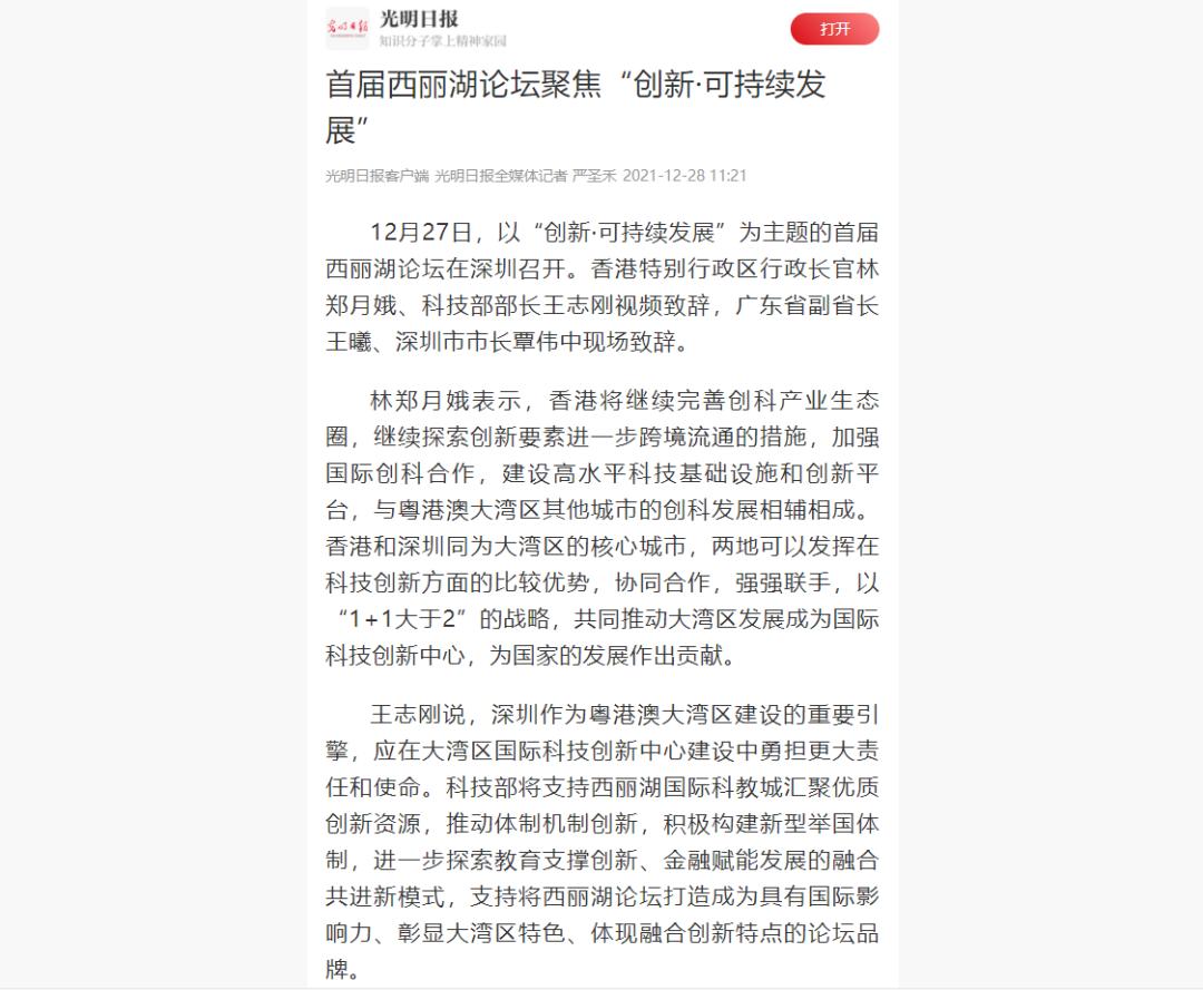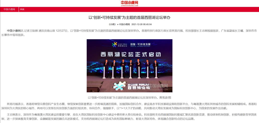 12月27日,以“创新•可持续发展”为主题的首届西丽湖论坛在深圳举办。香港特别行政区行政长官林郑月娥、科技部部长王志刚视频致辞,广东省副省长王曦、深圳市市长覃伟中现场致辞。
