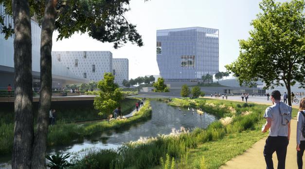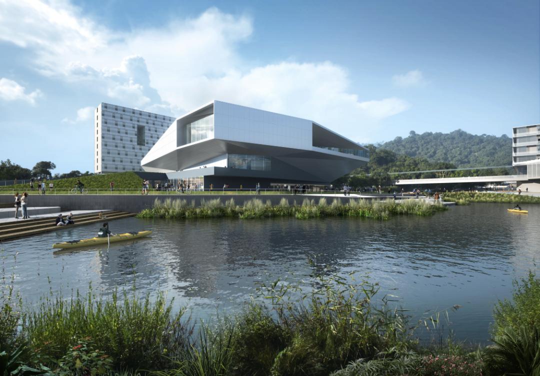 中央湖周边形成滨水活力之环,串联各个室内外公共休闲设施,水上运动,多级绿道,才艺剧场,都围绕滨水空间有机展开,西纳市域绿道激活城市链,东与郊野绿道衔接,形成一个城市与自然共生,青春活力的SIAT PARK( 生态校园)。