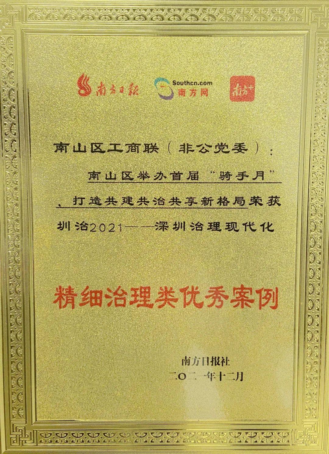 12月30日上午,圳治2021—深圳治理现代化榜单发布,南山区工商联(非公党委)“骑手月”活动荣获深圳治理现代化精细治理类优秀案例。