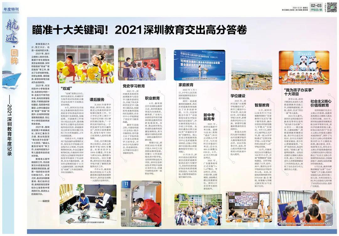 2021年,践行立德树人根本任务,着眼于学生德智体美劳全面发展,深圳积极落实“双减”“课后服务”等工作,推出了众多创新举措,在职业教育、课后服务、教学改革等方面成为全国典型。