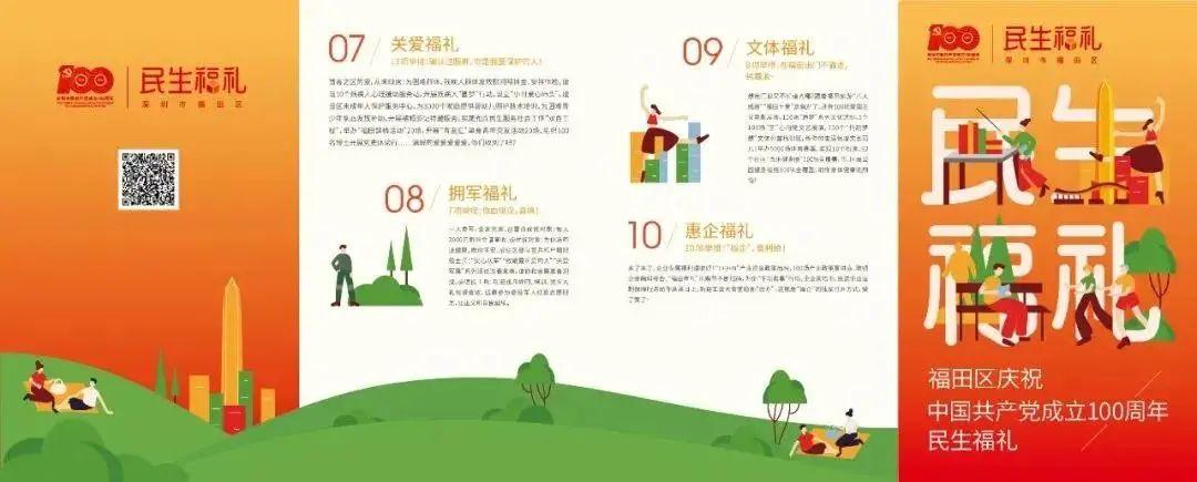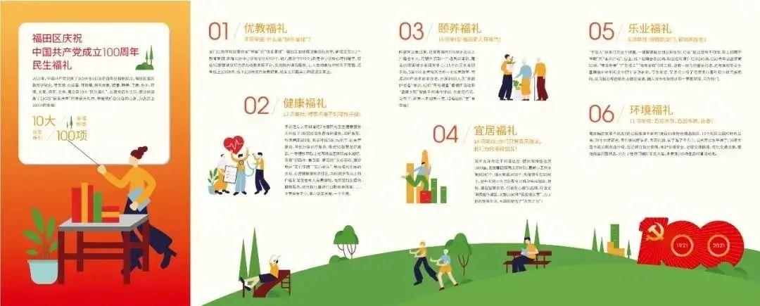 从2019年至今,福田区连续第三年推出“民生福礼”。今年,福田区以建党100周年为主题,以更大力度推出新的“民生福礼”。新的“民生福礼”包括优教、健康、颐养、宜居、乐业、环境、关爱、拥军、文体、惠企10大“民生福礼”100项惠民举措,囊括了“民生七有”的方方面面,涵盖了从婴幼儿到老年人的所有人群,覆盖面广、针对性强、感知度高,真真正正地为辖区居民服务、为辖区企业服务,体现了福田区委区政府的满满诚意。
