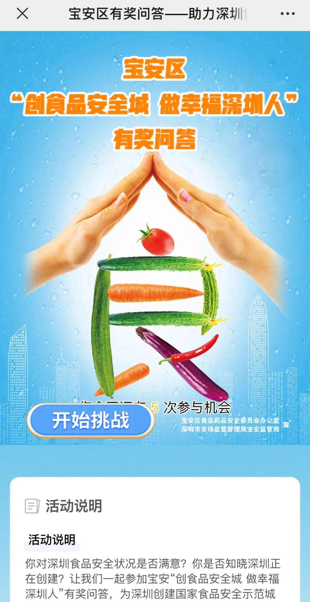 在创城全面冲刺阶段,宝安区食药安办、市市场监管局宝安局在线推出“创食品安全城 做幸福深圳人”有奖问答活动,市民通过扫描二维码参与活动,答题正确可抽取红包。有奖问答活动获得人民日报、澎湃新闻等媒体转发,仅4天时间,有奖问答链接点击量高达152万次。问答考题的设置贴合评测,贴近生活,在寓教于乐中实现创城知晓率、支持率、满意度的同步提升。