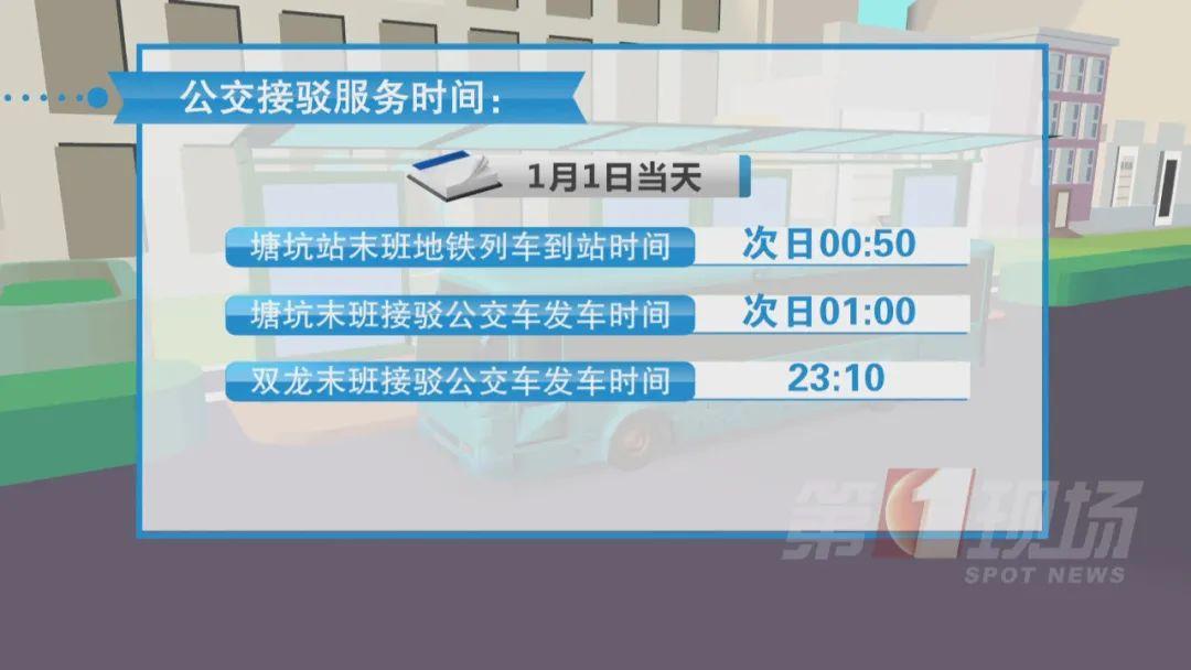 1月1日当天,塘坑站末班地铁列车到站时间为次日00:50,塘坑末班接驳公交车发车时间为次日01:00,双龙末班接驳公交车发车时间为23:10。