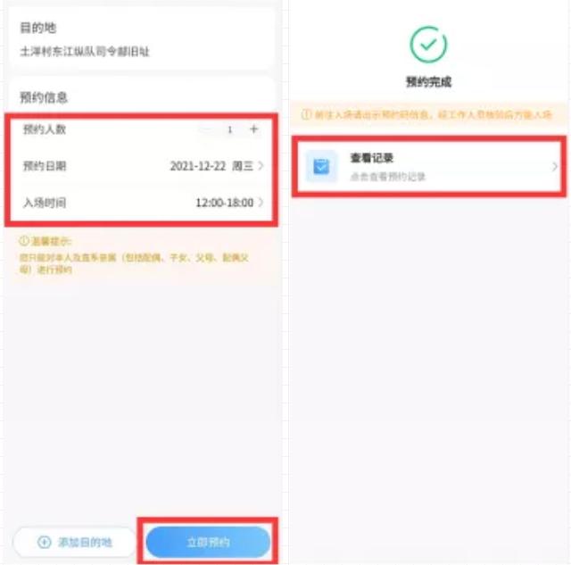 第二步:填写目的地预约信息,点击“立即预约”,预约完成。