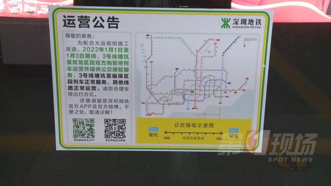 深圳地铁3号线塘坑站值班站长柳青青表示,为了配合大运枢纽施工改造,2022年1月1日至3日,深圳地铁3号线塘坑站至双龙站区段双向临时停运,塘坑站至福保区段将维持服务,其他线路正常运营。