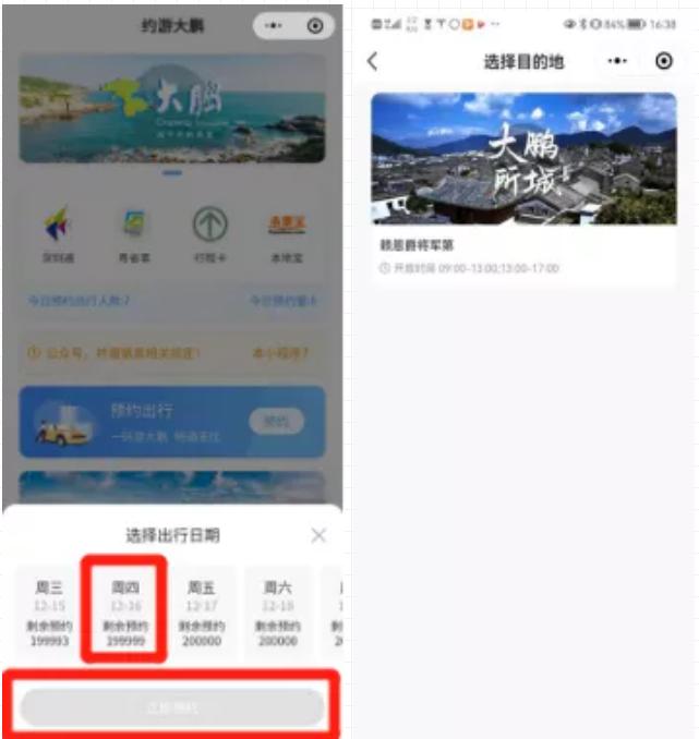 第一步:打开“约游大鹏”小程序,进入“首页”—点击“预约出行”,选择出行日期,点击“立即预约”,进入选择目的地,选择您要出行的景区。