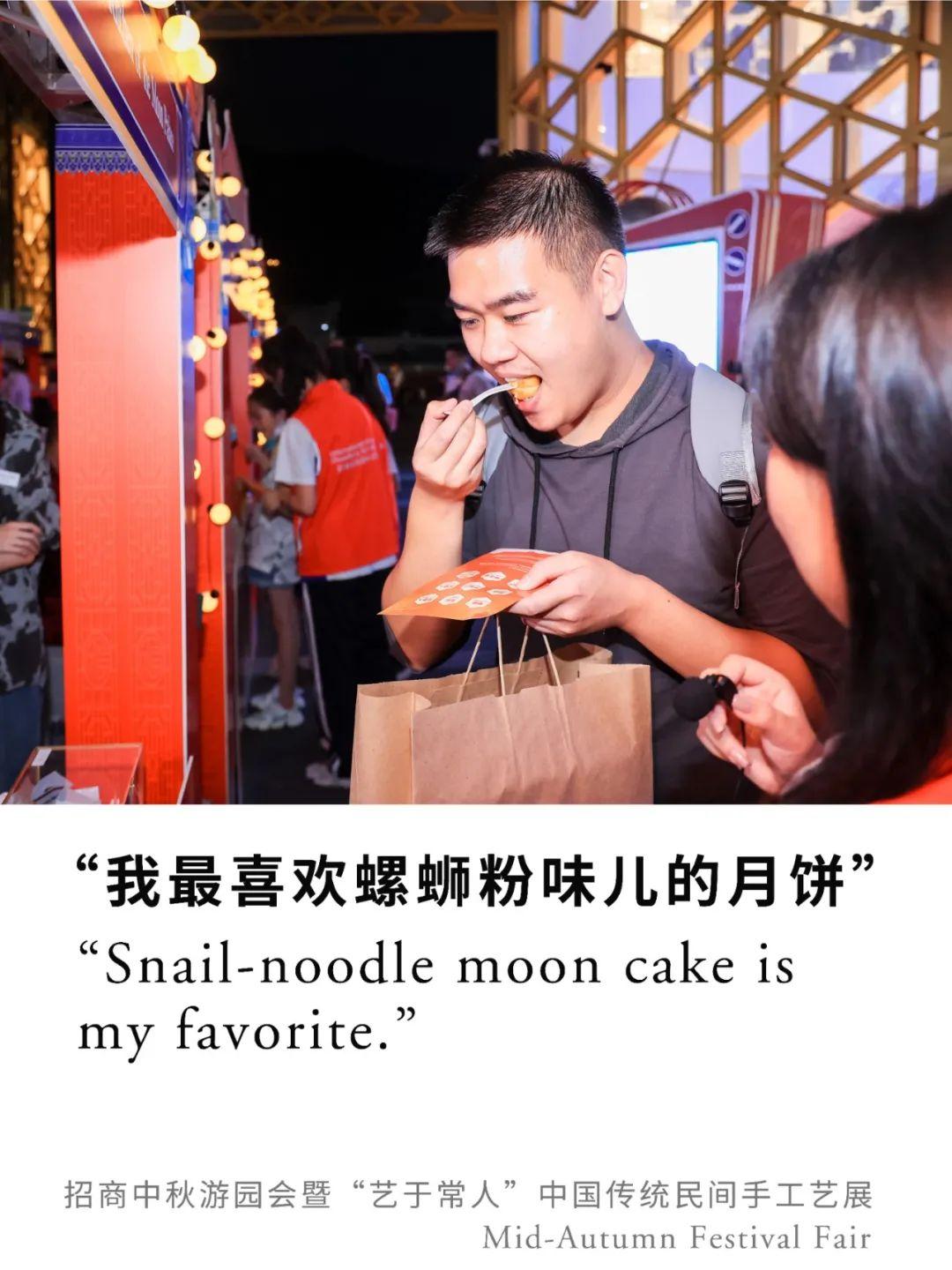 At the Mid-Autumn Festival Fair and Chinese traditional folk art exhibition, Noel, from Britain, tasted moon cakes with spicy beef, crayfish, and other flavors. He was full of praise for the one with snail noodles.