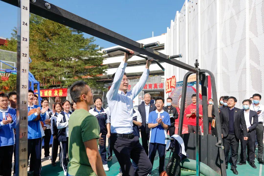 “我也来测测体能!”课后,注意到操场上有学生正在上体育课,黄伟走进其中,与同学们比赛起做引体向上,一口气做了20个,引来现场学生们阵阵掌声。他勉励学生在实现“双减”的同时,要注重增强体能锻炼,保持良好的体魄,做德智体美劳全面发展的有用之才。