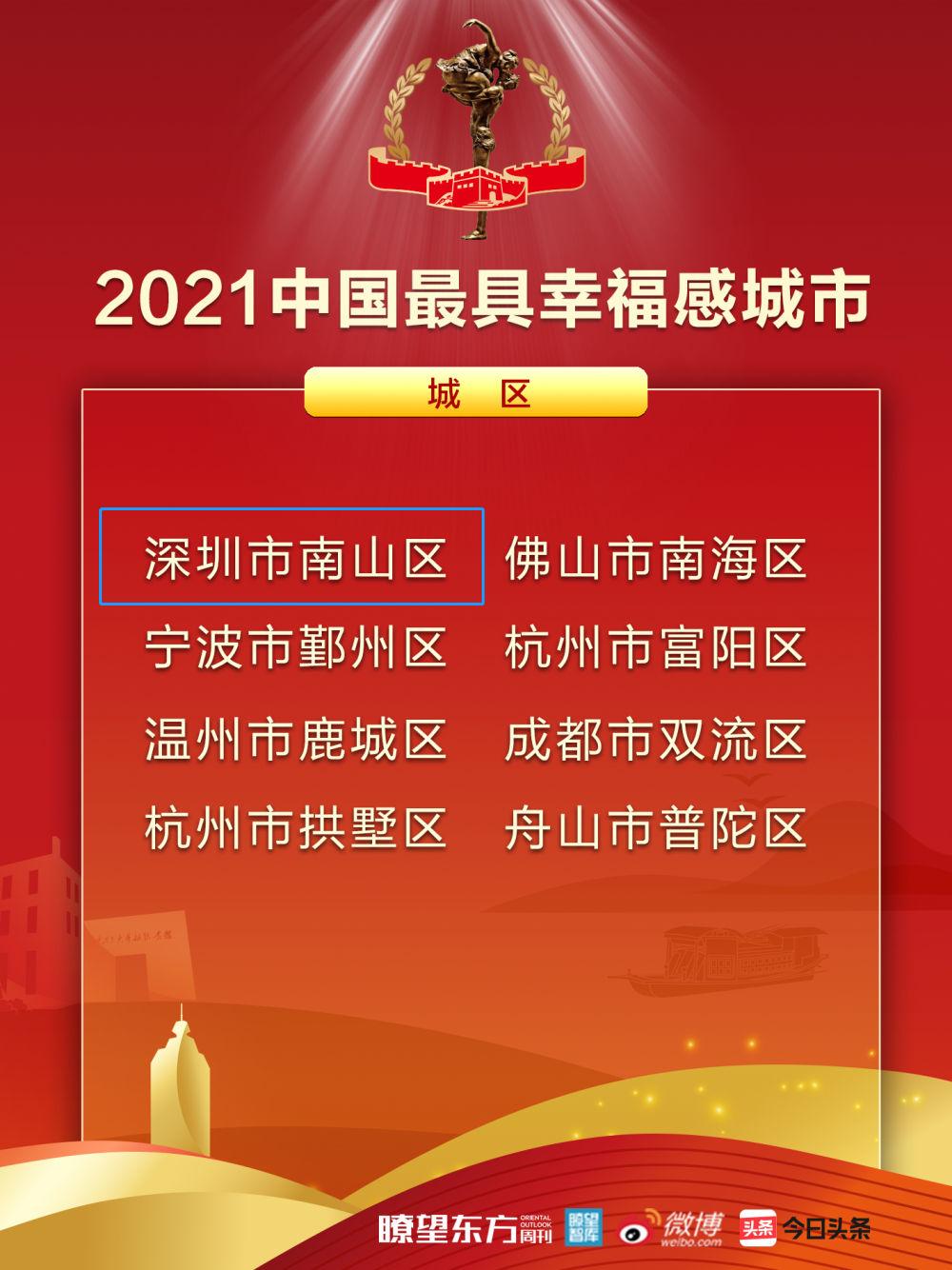 活动历时5个多月,经过大数据采集、问卷调查、材料申报、实地调研、专家评审等环节的严格遴选,深圳市南山区、佛山市南海区、宁波市鄞州区、杭州市富阳区、温州市鹿城区、成都市双流区、杭州市拱墅区、舟山市普陀区被推选为“2021中国最具幸福感城区”。